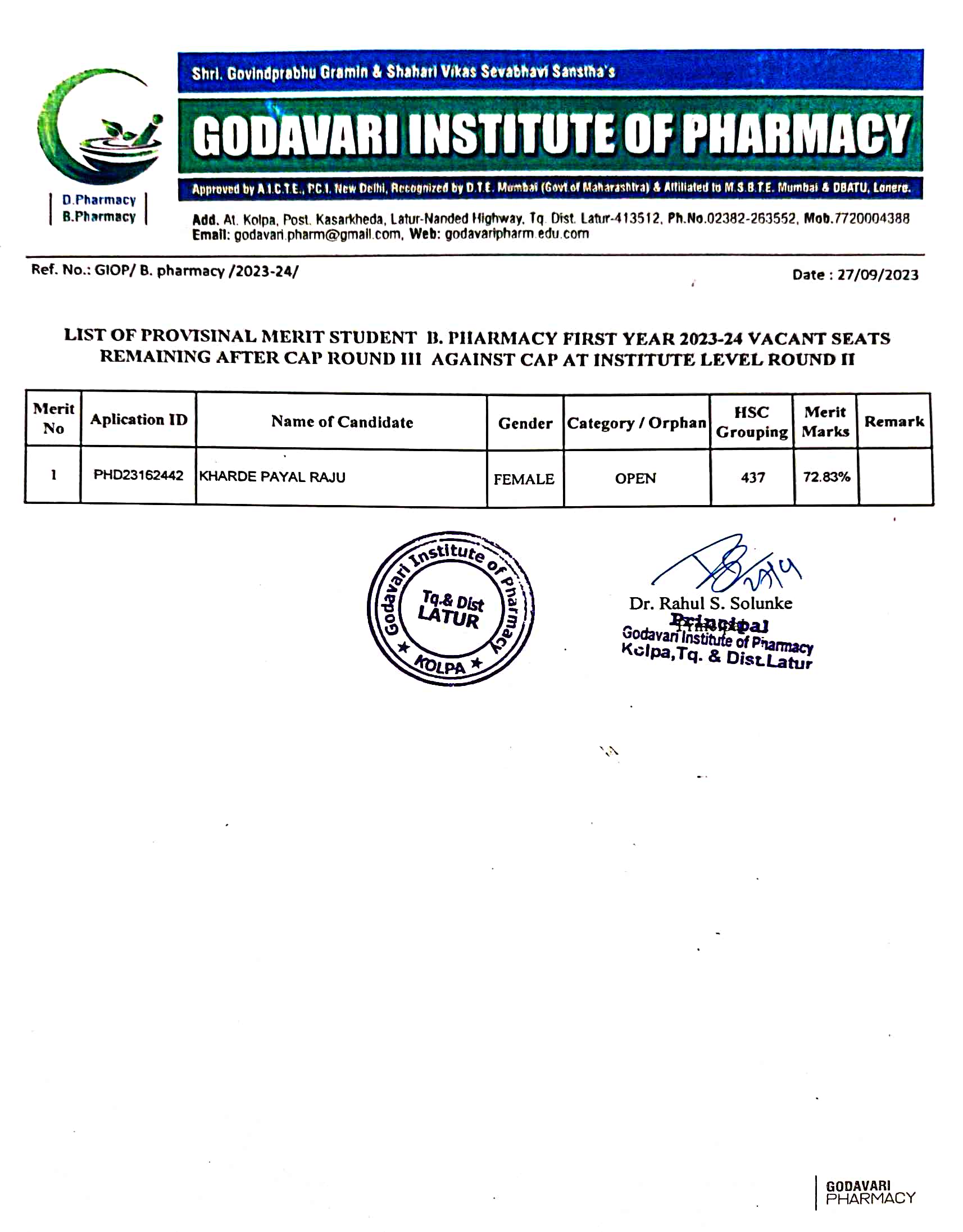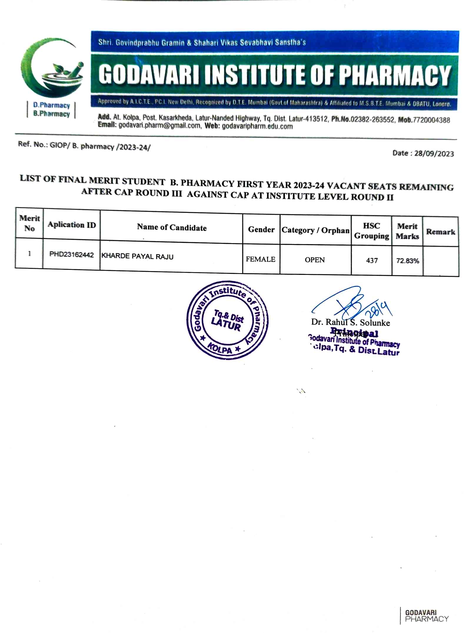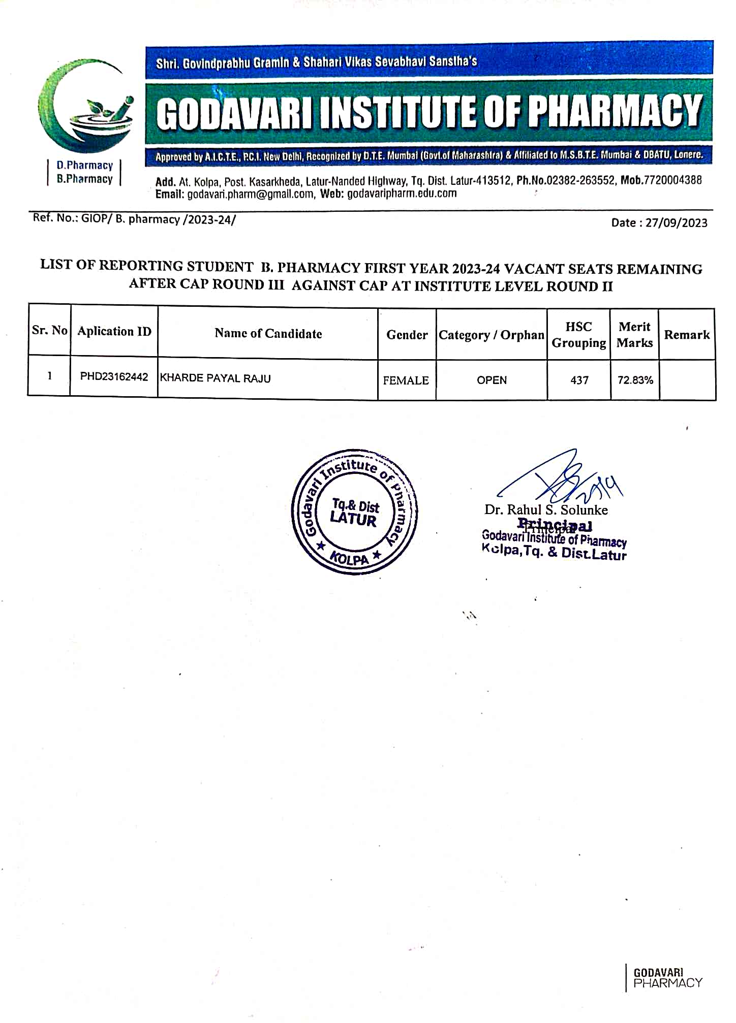 Approved by PCI,New Delhi, Recognized by the Govt. of Maharashtra & DTE Mumbai & Affiliated to MSBTE,Mumbai & DBATU,Lonere